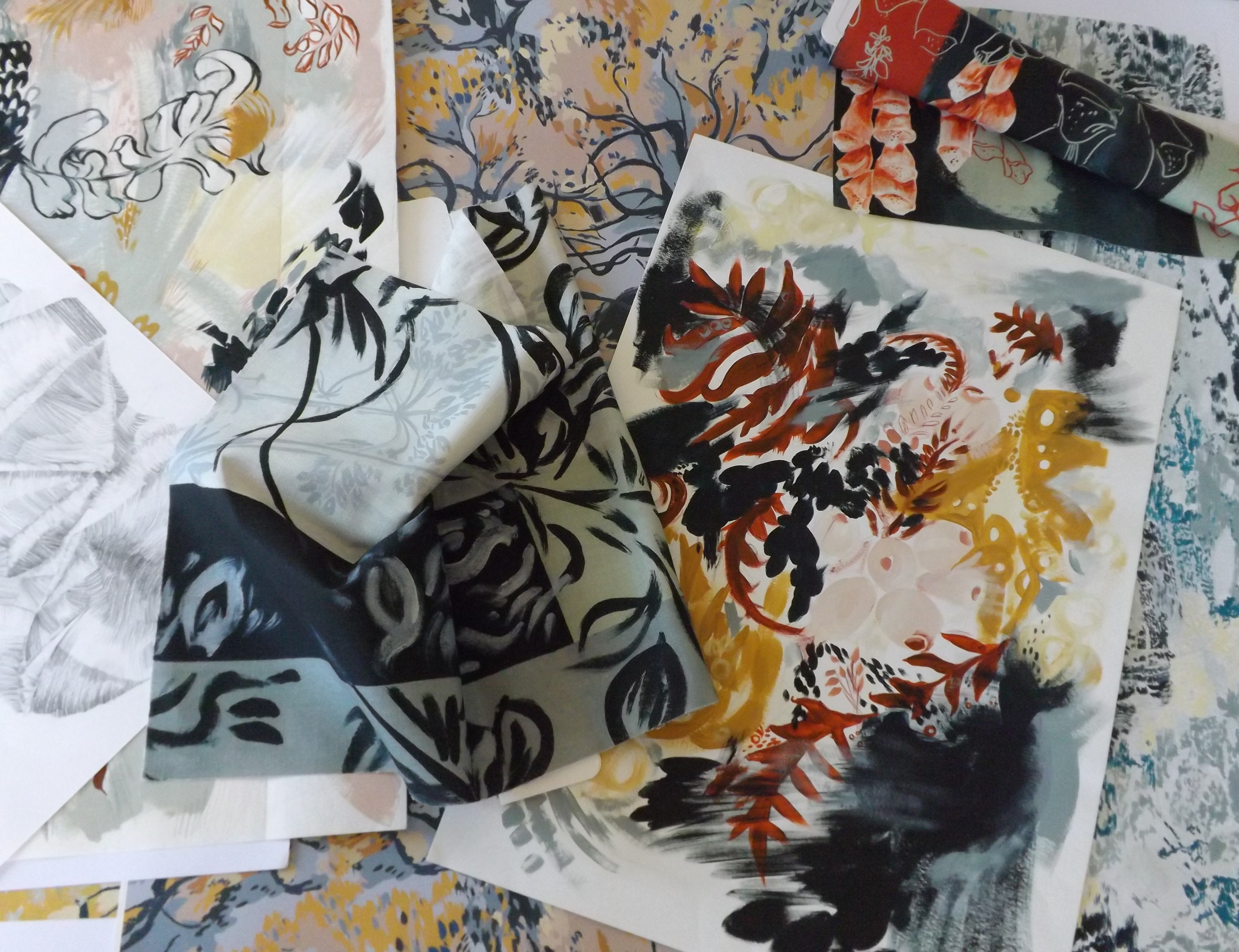 “All my design work starts with drawing and painting. I use my initial sketches and photographs from local walks as a beginning point. Back in the studio, I develop patterns and designs. My course is very drawing based. Every day I am in the studio drawing and creating new ideas.”