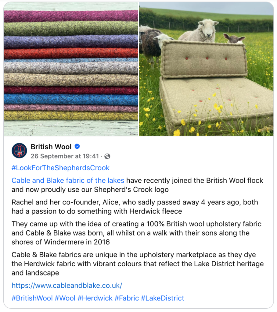 We are now members of British Wool, see their Facebook post below. British wool collect, grade and sell the wool on behalf of sheep farmers in the UK. Visit British Wool’s website find Cable & Blake goods plus your nearest retailer of British Wool products.